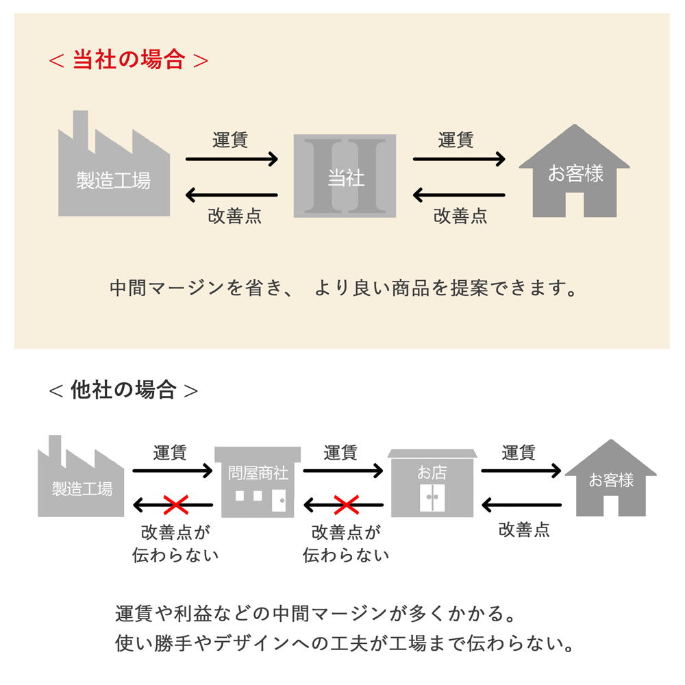 通常は商品が工場から消費者まで渡る間に商社や問屋が入りますが、当店は直接工場から商品を入れていますので、中間マージンがかかっておりません。
